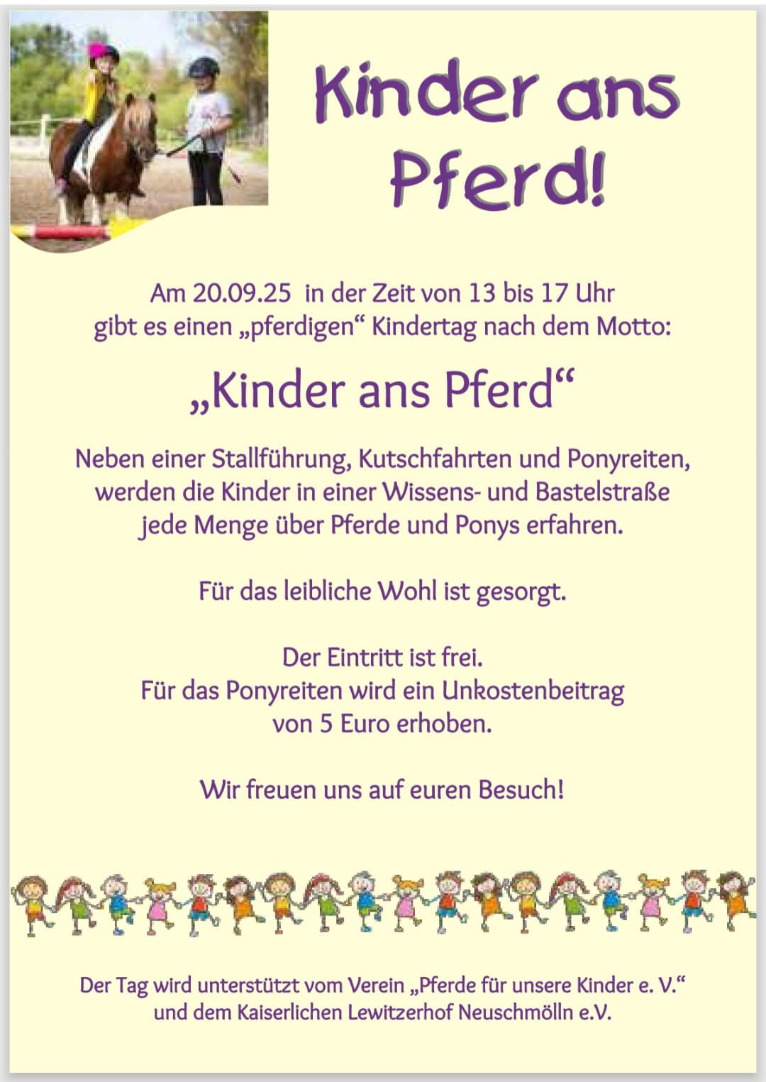 Am 20.09.25 feiert der Lewitzerhof einen pferdigen Kindertag unter dem Motto: "Kinder ans Pferd" nachmittags von 13 Uhr bis 17 Uhr.Es erwartet die Kinder ein kleines Programm mit Spaß und Spiel rund um das Thema Pferd.