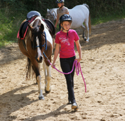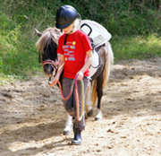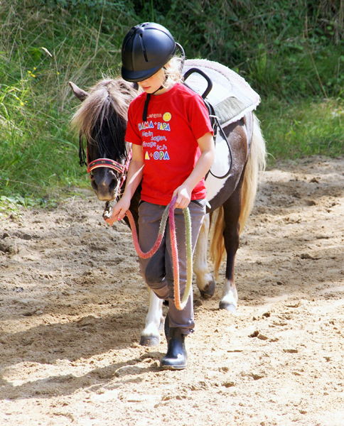 Nur das richtige Größenverhältnis Kind/Pferd garantiert den Aufbau einer harmonischen Beziehung zwischen Mensch und Tier. Als Regel sollte gelten: Das Kind muss das Pferd mit seinen Händen an jedem Körperteil berühren und ihm selbstständig Halfter, Trense und Sattel anlegen können.Zurück